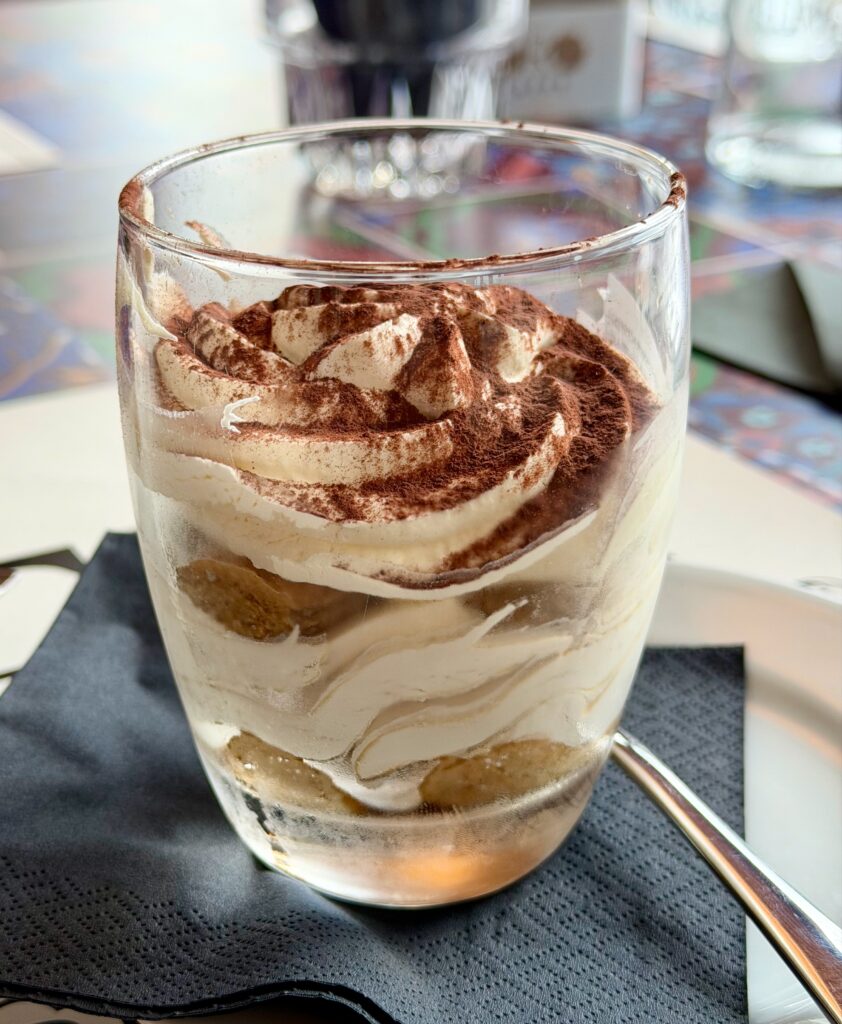 - Homemade tiramisù — rich mascarpone cream layered with espresso-soaked savoiardi paired with a glass of Ratafiocco Còs